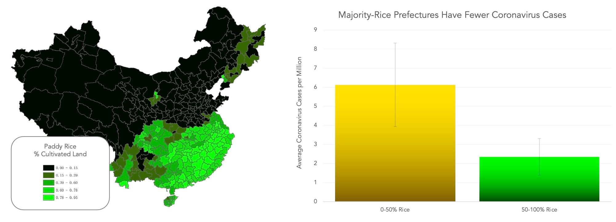 Rice-farming areas of China also experienced fewer Covid-19 cases than wheat-farming areas. This was true even controlling for things like economic development, healthcare resources, and population density.