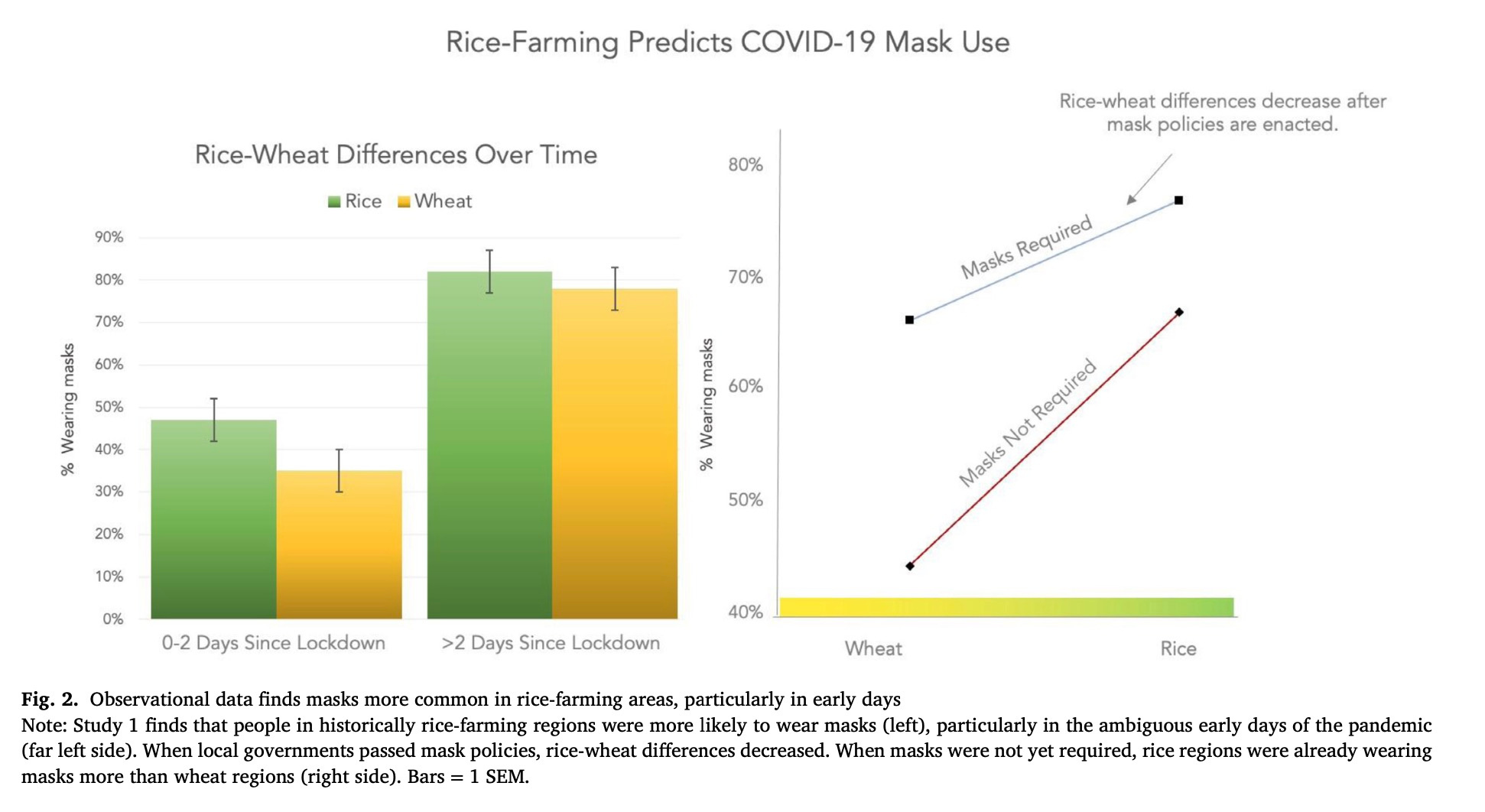 The history of rice farming could help explain why rice-farming cultures in the modern world tend to report tighter social norms and more binding social relationships. Strong social norms can help with disease prevention efforts, like wearing masks and staying at home. For example, within China, people in rice-farming areas wore masks in public more often than people in wheat-farming areas, especially in the early days of the outbreak, when the threat was ambiguous.
