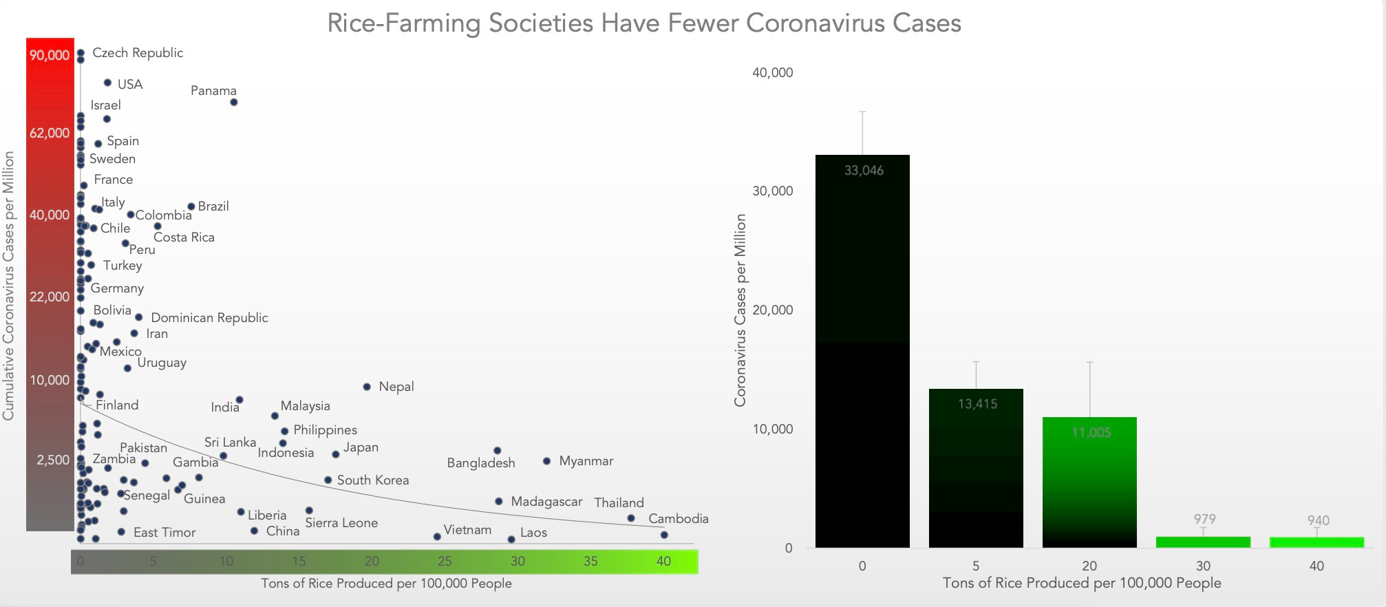 Several studies have compared countries around the world to ask why some had more deaths per capita in the Covid-19 pandemic than other countries. For example, cultures with a history of rice farming like Japan, Malaysia, and Madagascar had just 3% the deaths of other countries.
