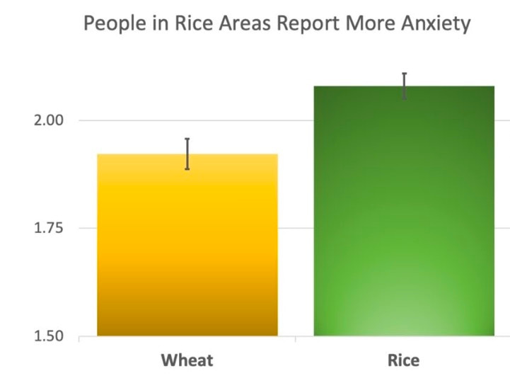 People in rice areas reported more anxiety on average.
