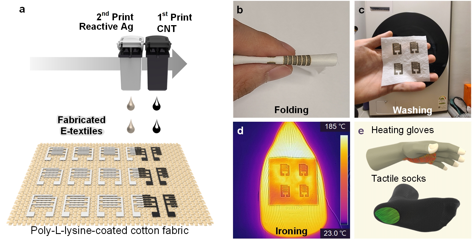 In addition, by treating the fabric with poly-L-lysine, a positively charged and biocompatible polymer, we promoted strong ionic bonding between the negatively charged conductive nanomaterials and the cotton fibers, thereby overcoming the durability issues of conventional e-textiles. The fabricated textiles maintained their conductivity even under mechanical deformation, such as bending and twisting, and retained stable performance even after 10 household washing cycles. This represents a significant improvement compared to conventional e-textiles, which are either non-washable or require protective coatings that reduce breathability to achieve washability.