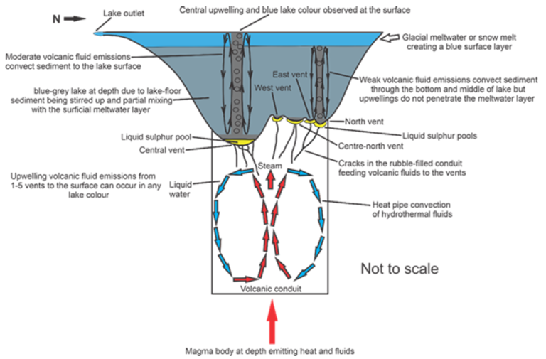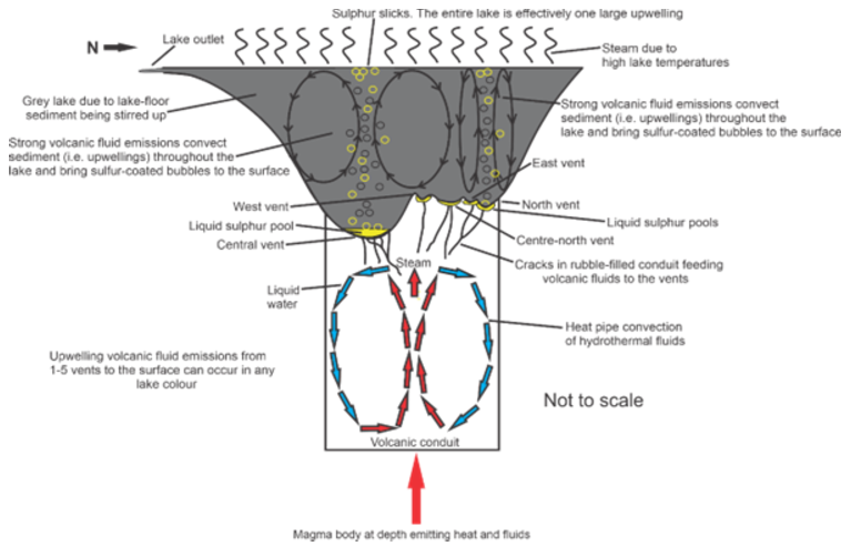 Circular grey upwellings are interpreted to be lake-floor sediment carried to the lake surface by volcanic fluids. These upwellings varied from metres to hundreds of metres in diameter, and either appeared and disappeared in less than 10 minutes, or remained present for hours. The locations of upwellings were used to identify five vent locations beneath the Crater Lake, three more than were previously known. Upwellings from the central vent were much larger than the other 4 upwelling locations, suggesting that a grey lake only resulted from central vent activity. Yellow or black elongate sulphur slicks are composites of thousands of small bubbles coated in sulphur, and are produced by volcanic fluids rising through a layer of liquid sulphur at the bottom of the lake and then being carried to the surface. Steam above the lake surface was only seen when the lake temperature was over 30 °C, with it being more abundant on cloudy days. The shape of the steam was circular during low wind conditions, and in high winds it formed sheets of steam blown across the lake.