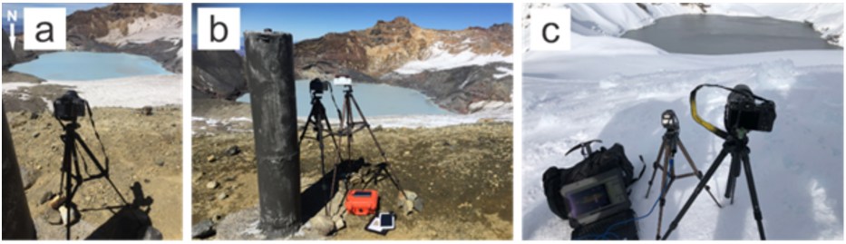I began this study by looking at thousands of images of the Crater Lake that had previously been obtained by GNS Science, local iwi Ngāti Rangi, and various other sources. For every image I documented the lake colour, discolourations on the lake surface, and if steam was visible. Yes, this is as painful as it sounds. I looked at ways to automate this process, however due to differing camera angles and cloud conditions, and lack of consistent reference points, this proved difficult. Thankfully, some analysis had already been completed by GNS Science, so I built on this previous work. By chance, while I was on Ruapehu for a university field trip, my professor and I decided that I should climb to the Crater Lake and observe it. We found that the Crater Lake surface had numerous yellow and grey discolourations that changed location in a matter of minutes, something previously unknown to us. This was important as these discolourations were thought to indicate material being carried from the vents at the floor of the lake to the surface by volcanic processes, and could indicate where the volcano may erupt from in the future. We decided that systematic fieldwork with an array of cameras was necessary to better understand the location and timing of these volcanic processes.