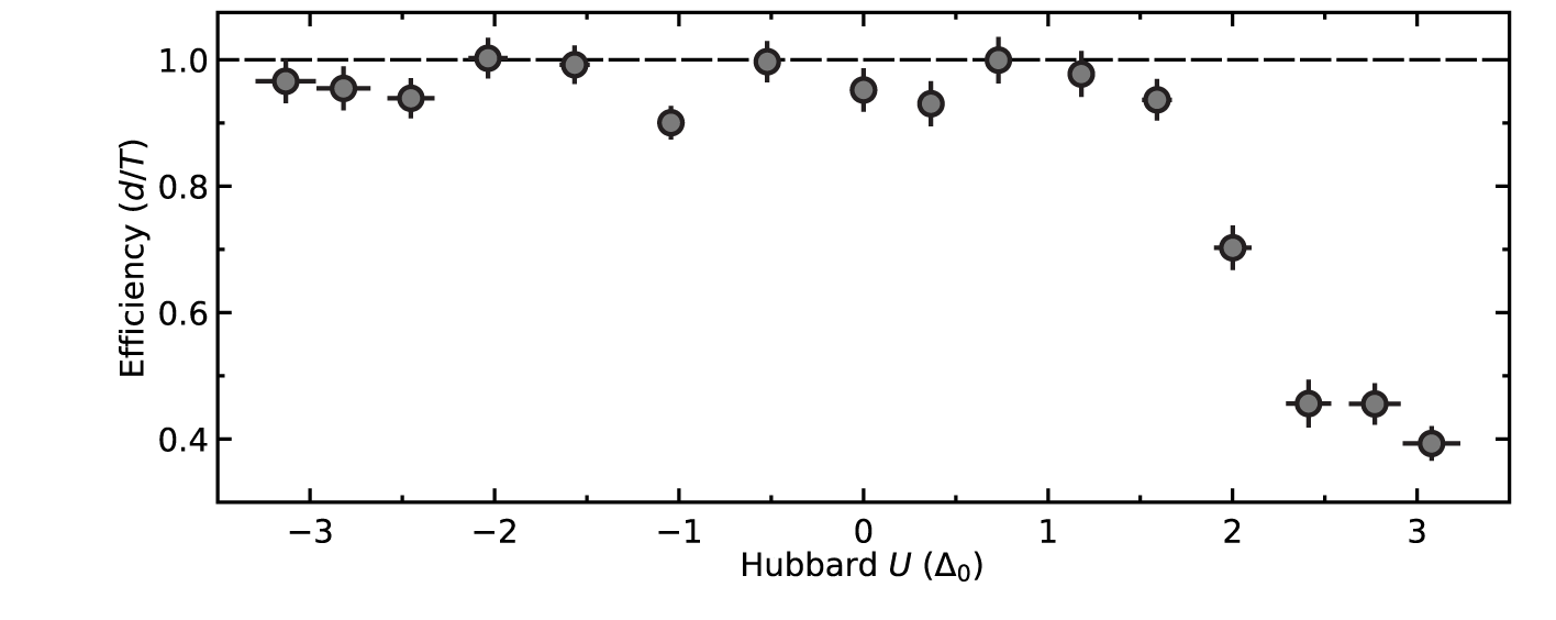 In a first experiment, we confirm the presence of topological pumping for non-interacting atoms. The measured efficiency is 0.95(3) unit cells per period, very close to the quantised value of unity. We then repeat the measurement for a range of Hubbard U, keeping the lattice filling and other experimental parameters fixed. The results of this measurement are shown below in Fig. 2.