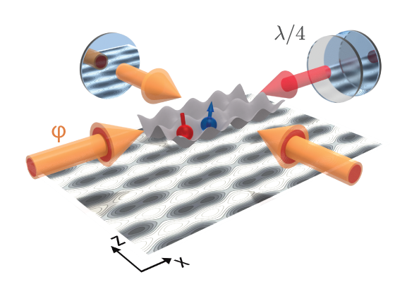 In our work, we employ a novel dynamical superlattice to realise a topological pump of ultracold fermionic potassium-40 atoms (Fig. 1). Ramping the phase φ of one of the laser beams, leads to a pumping motion in the x-direction, whose efficiency we record by taking successive photos of the moving cloud of atoms.