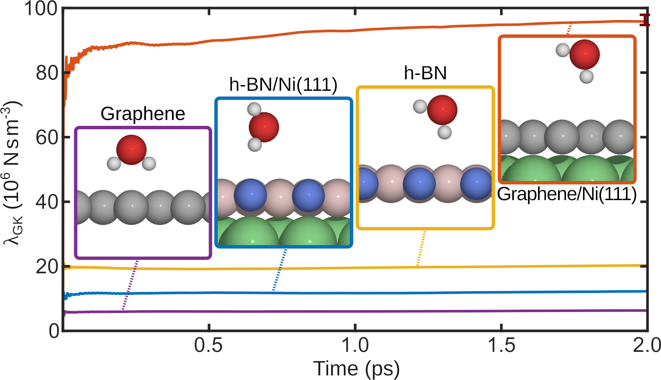 To quantify how easily water moves, we calculated the atomic-scale friction coefficient λGK using the Green-Kubo formalism, based on forces obtained from AIMD simulations. Interestingly, for freestanding materials, friction on h-BN is higher than on graphene — consistent with previous results by Tocci et al.[7] However, when supported on a Ni(111) substrate, this relationship is reversed.
