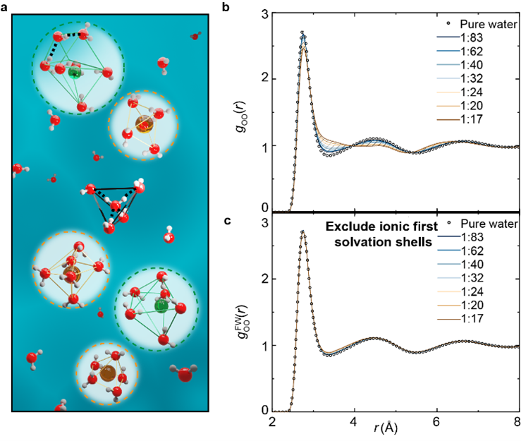 Fig. 2a shows the microscopic structure of sodium chloride solutions. The electronic orbitals in a water molecule adopt the well-known sp3 hybridization, giving rise to the near-tetrahedral structure of water. On the contrary, Na+ and Cl- ions both have a closed-shell electronic configuration. Therefore, structures of ionic first solvation shells are largely different from the tetrahedral structure of pure water. The fraction of first solvation shells increases with increasing salt concentration, which results in the change of structure factors (Fig. 1b) and radial distribution functions (Fig. 2b) of NaCl solutions with increasing salt concentration.