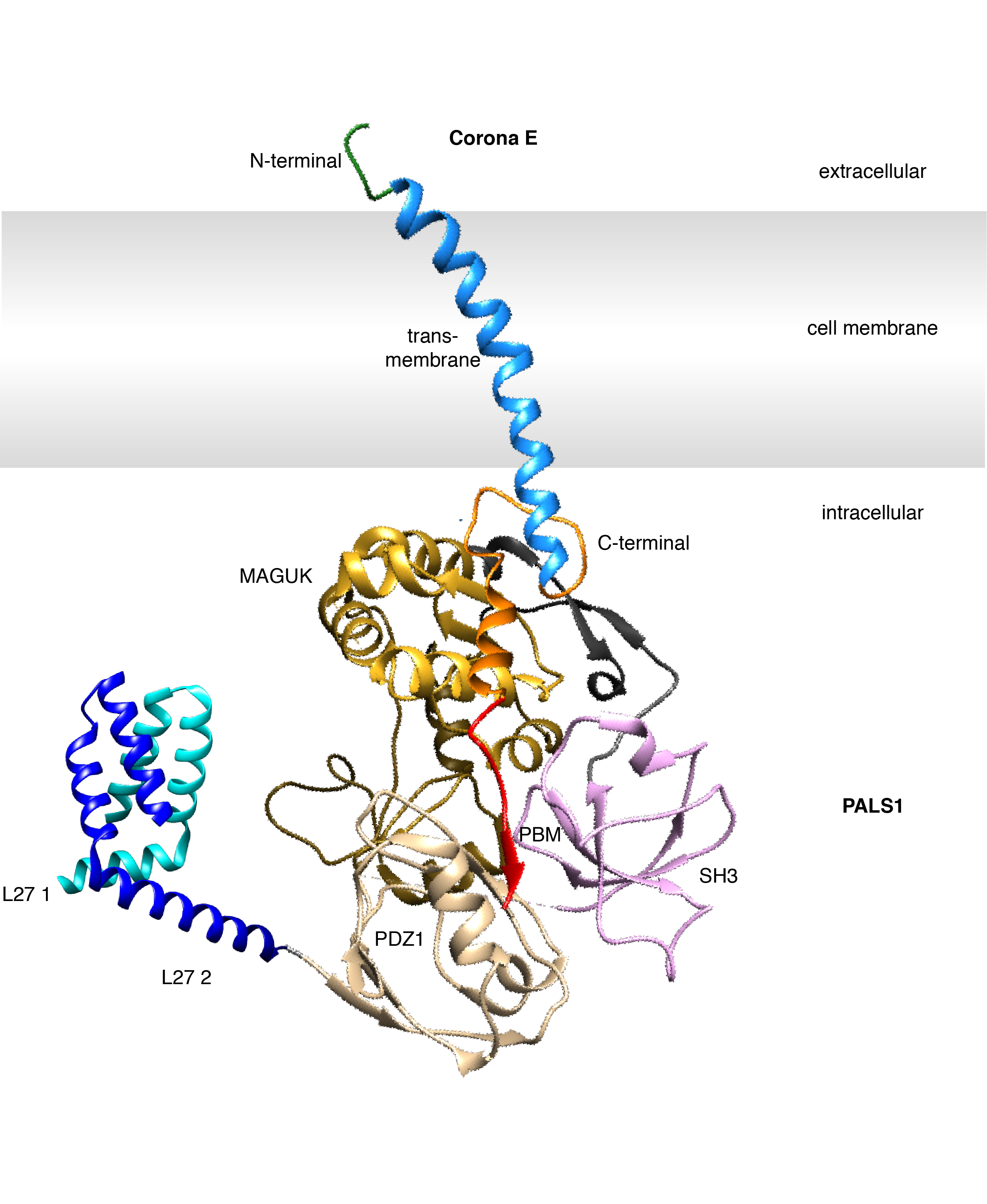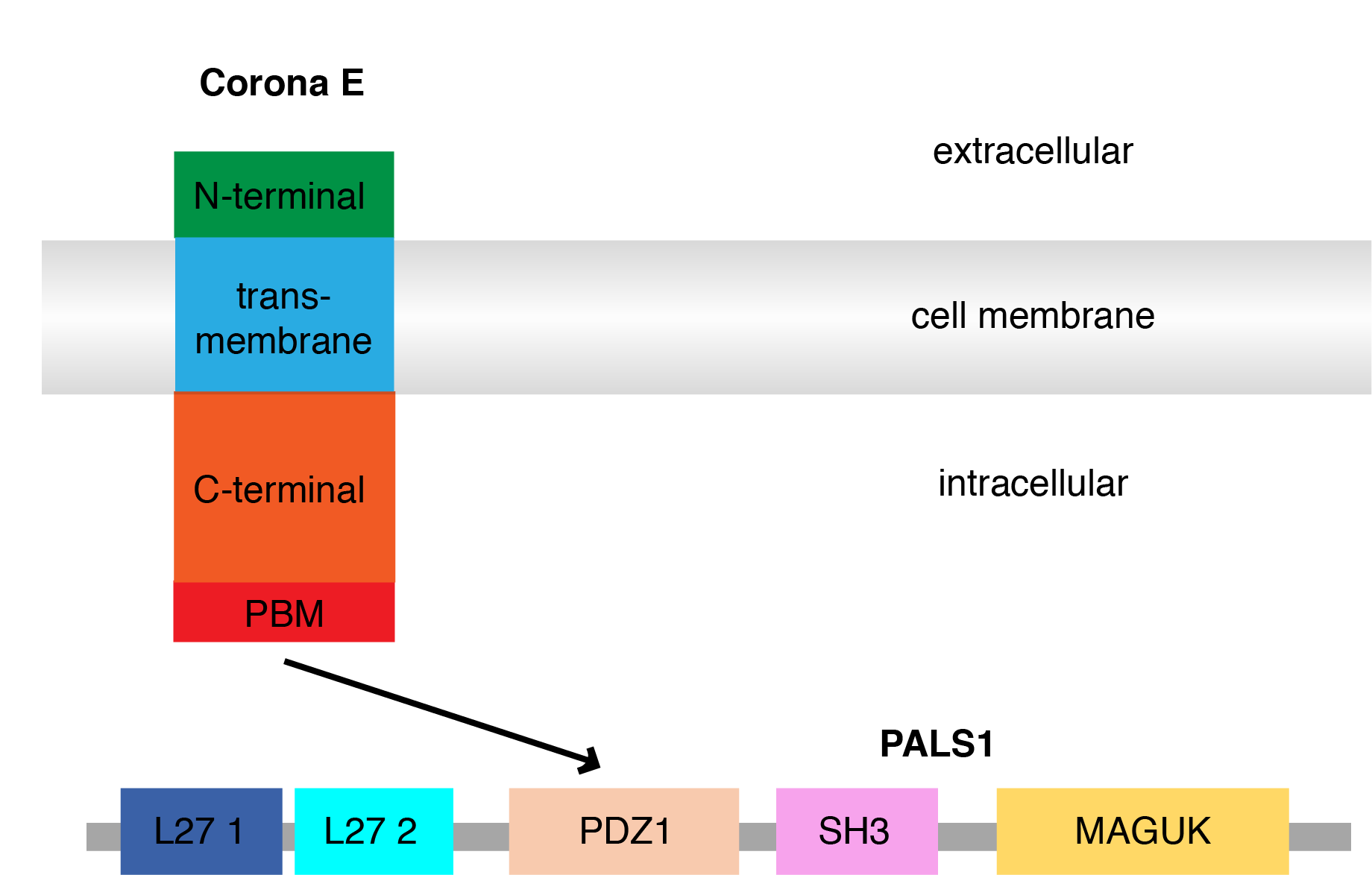Fig.2 Schematic diagram of domains of SARS-CoV-2 E with PALS1 PDZ1 interaction.