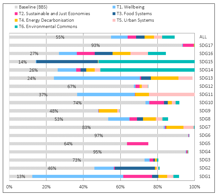 - Large positive spill-overs and synergies for the SDGs are also found from additional investments in adaptation and resilience (T1) and transforming the food system (T3) – the latter of which is critical to make gains on biodiversity goals.