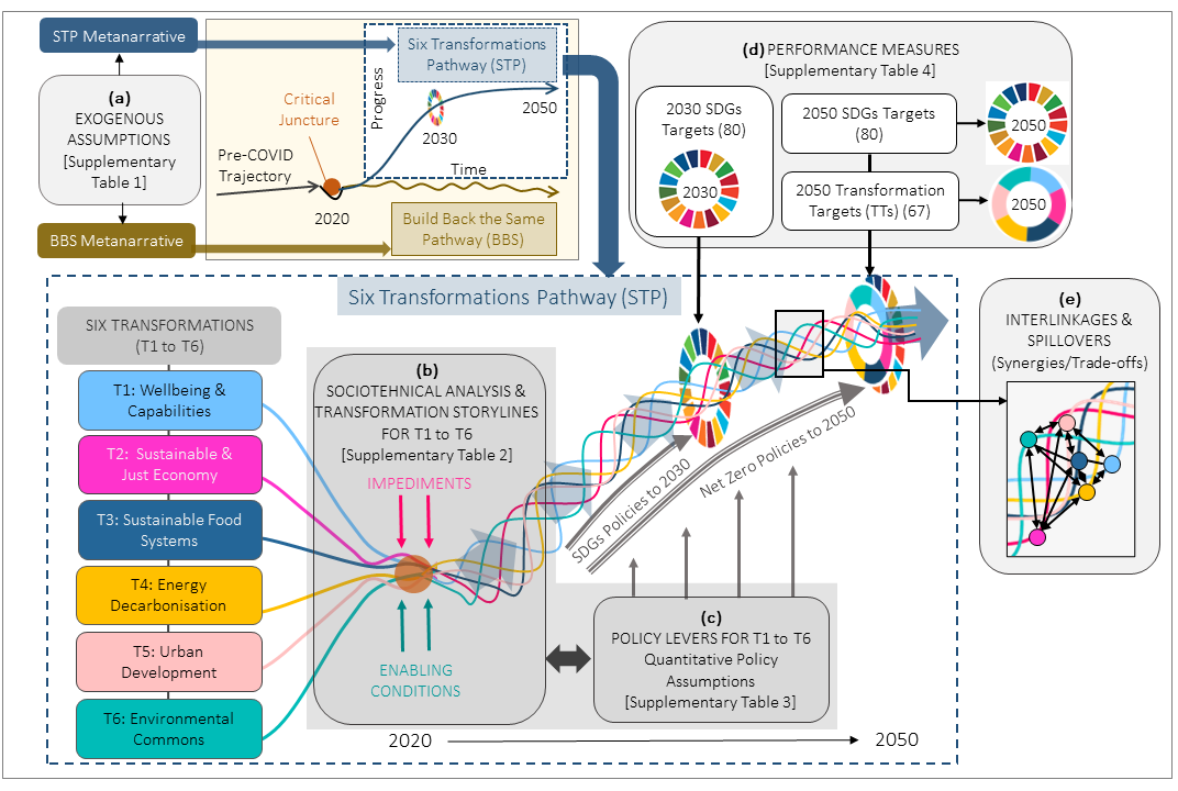 We project two alternative post-COVID recovery pathways for Australia that diverge from a critical juncture after 2020 (Figure 1, top panel). Firstly, a 'Build Back the Same Pathway' (BBS) is used as a baseline and signals a return to the pre-COVID status quo. Contrasting this, our 'Six Transformations Pathway' (STP) involves the acceleration of six transformations to achieve the SDGs (Figure, main panel). Each transformation (labelled T1 to T6 in Figure 1) includes a set of quantitative policy levers used in the model projections and a qualitative sociotechnical analysis and transformation storyline. Model projections evaluate the performance of each pathway on the SDGs in 2030 and 2050 as well as interlinkages and spill-over effects between the transformations and the SDGs, including synergies and trade-offs.