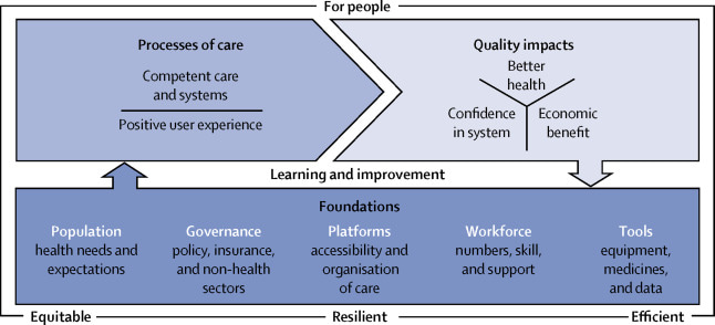 Today, The Lancet Global Health published a landmark report entitled High-quality health systems in the Sustainable Development Goals era: time for a revolution. In this Commission, the authors assert that providing health services (i.e. coverage) without guaranteeing a minimum level of quality is ineffective, wasteful, and unethical. What is needed, the Commission argues, are high-quality health systems that optimise health care in each given context by consistently delivering care that improves or maintains health, by being valued and trusted by all people, and by responding to changing population needs. The graphic below shows the HQSS framework for a high quality health system.