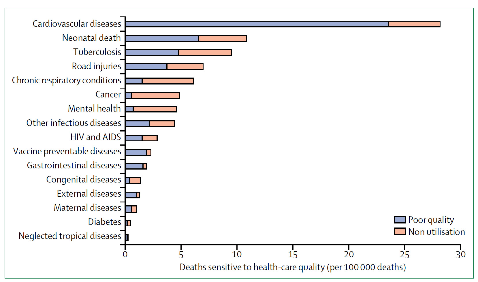 Throughout the report, tuberculosis is used as a key example, to illustrate the need to go beyond coverage and focus on quality of care. According to the HQSS report and a linked analysis published in The Lancet, more than 8 million people per year in LMICs die from conditions that should be treatable by the health system. 60% of deaths from conditions amenable to health care are due to poor-quality care, whereas the remaining deaths result from non-utilisation of the health system.