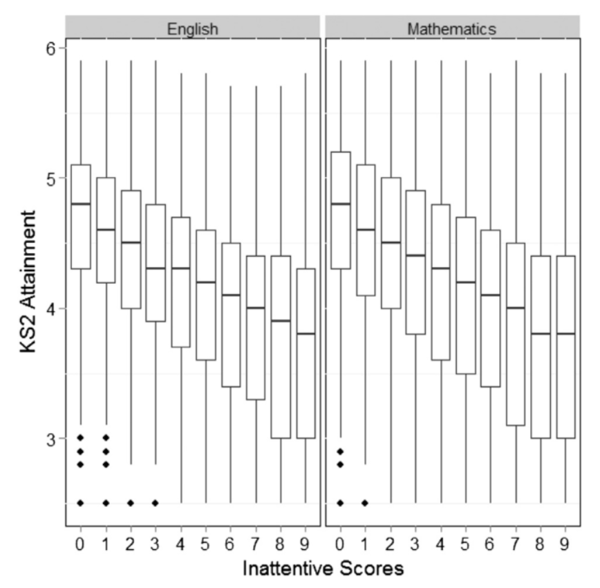 It’s hardly news that distracted students are a common bugbear amongst teachers, and few would dispute the general sentiment that attention is important to education, but oddly there has been little serious investigation (outside of children diagnosed with ADHD) into precisely when and how attention skills impact students in the classroom. This is strange because there is good evidence that attention skills (or lack of them) strongly predict academic attainment in subsequent years for all students, not just those with ADHD diagnoses (Breslau et al., 2009; Duncan et al., 2007; Merrell et al., 2016), with the effects of inattention potentially becoming more detrimental the further students progress through education (Merrell and Tymms, 2001). Importantly, these effects are no means isolated to the tail of the distribution; they are felt well beyond the confines of the clinical ‘ADHD’ boundary. The plot below from Merrell et al. (2016), for example, demonstrates a linear relationship between inattention scores at age 5 and Key Stage 2 performance in Maths and English; even relatively minor decreases in attention skills have a measurable impact on school attainment.
