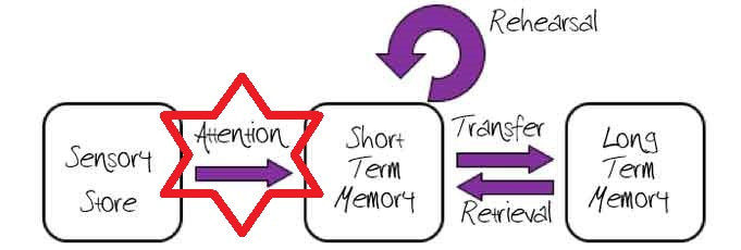 Attention is a fascinating cognitive ability to study because it straddles the boundaries between low-level and higher-level brain processes. Whilst the exact relationship between attention and other cognitions such as working memory and intelligence is still being mapped out, the fact that attention can operate so early in the processing stream makes it inevitable that it will have effects on any attempt to use the information further down the line. We cannot process what we don’t let in. Although a little outdated now, the Multi-Store Model of Memory (Atkinson & Shiffrin, 1968) is a useful visual illustration of this attentional bottleneck into our memory systems.