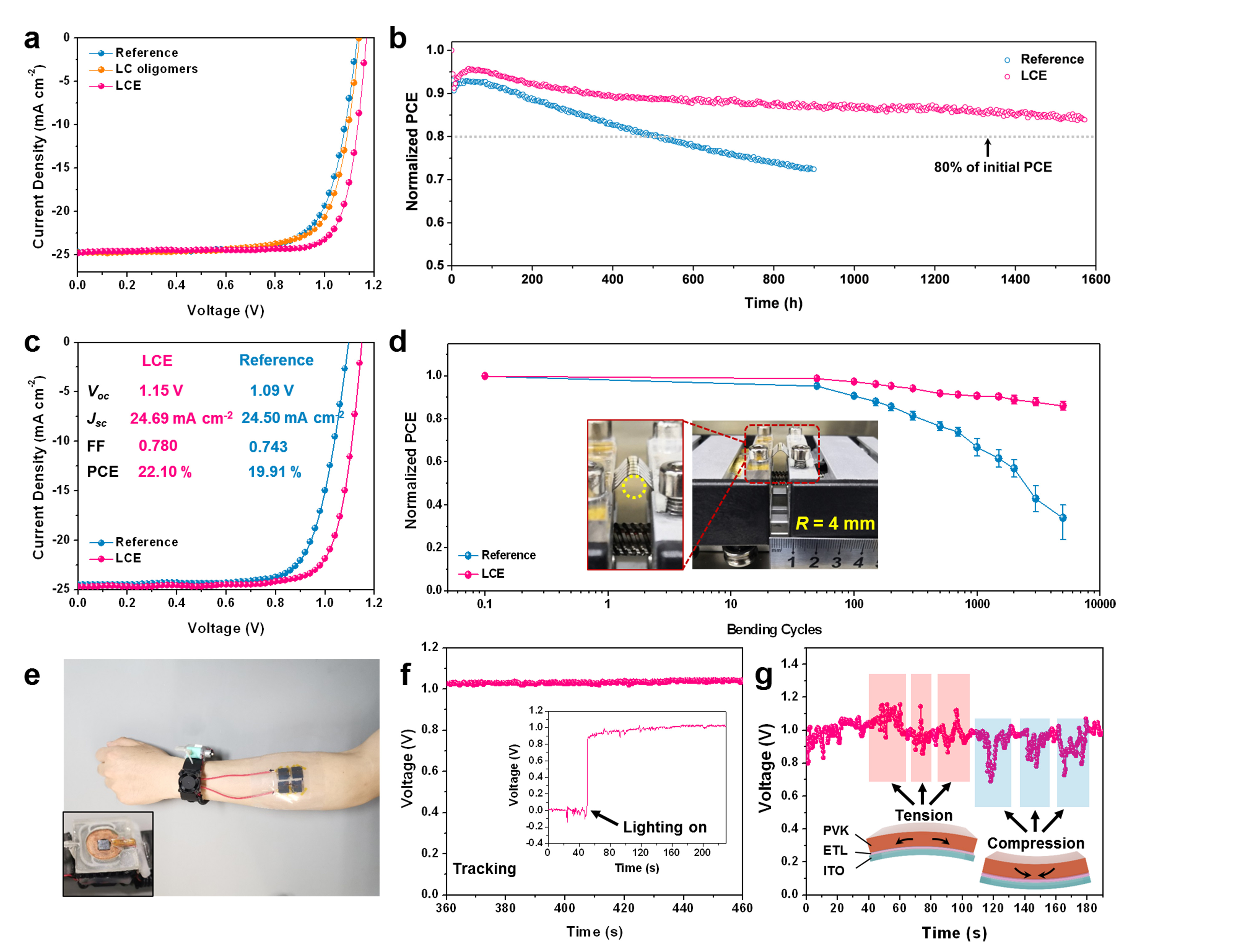Figure 3. Performance of PSCs. a J-V curves of the champion PSC devices based on reference, LC oligomer, and LCE. b Continuous operational stability of the unencapsulated PSC devices based on reference and LCE under flowing N2. c J-V curves of the champion flexible PSCs based on LCE and reference, respectively. d Normalized average PCE values for flexible PSCs as a function of bending cycles with the bending radius of 4 mm. e Photographic image of the IoT system based on flexible PSCs under ambient light. The inset shows the wearable haptic device. f Time-dependent voltage for continuous tracking of the IoT system. The inset shows the light-on photovoltage. g Mechanical bending test for the integrated wearable device under continuous illumination. The inset shows the schematic illustrations of the integrated device under tension or compression strain.