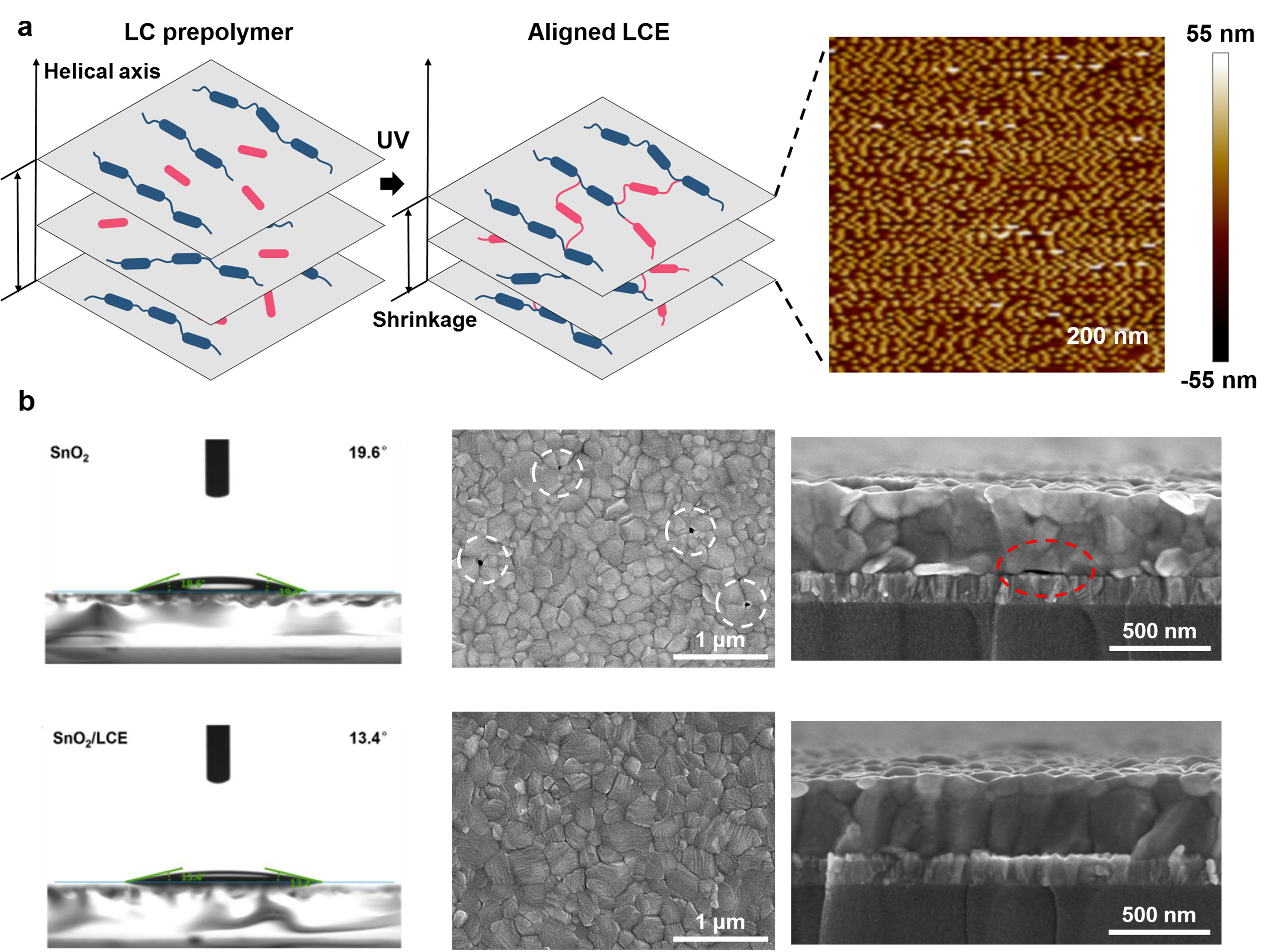 Therefore we explored the goal of more robust interfacial contact between ETL and perovskite layer. We found that using a well-aligned liquid crystal elastomer (LCE) can simultaneously maintain excellent charge collection and minimize charge recombination at the bottom interface. The molecular ordering is instantly locked upon photopolymerization of liquid crystalline diacrylate monomers and dithiol-terminated oligomers. It provides high surface energy and nucleation density, which promote the film densification process (Figure 1).