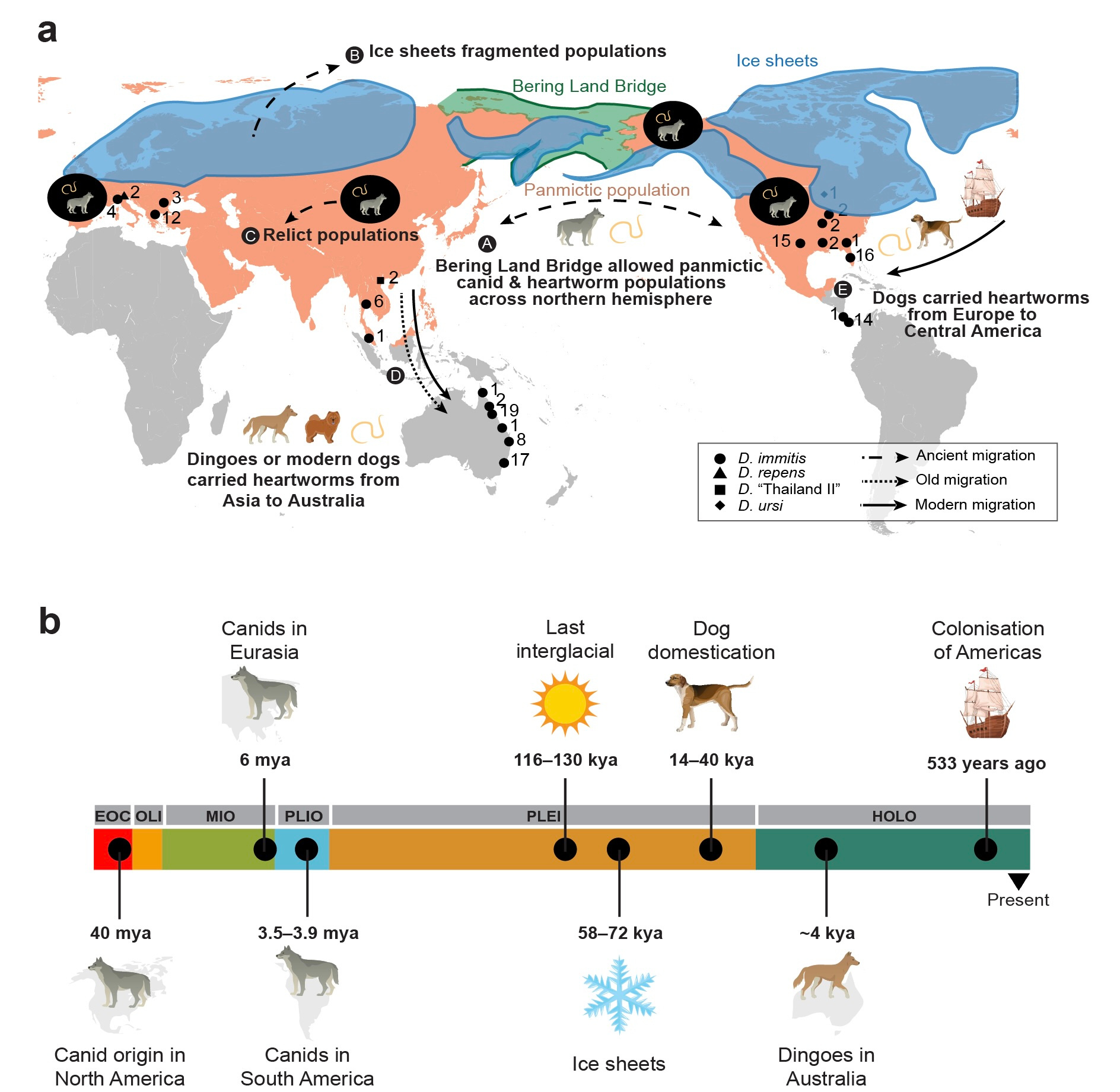 Our hunch was correct: heartworms are indeed ancient, and they dispersed across the world much earlier than previously thought. In our genome-wide study, we found that each continent harbours its own distinct heartworm population. Their population size histories show periods of similarity during interglacial times, when ancient canids likely moved freely between North America and Eurasia, and clear separations during ice ages, when ancient canids populations became isolated.