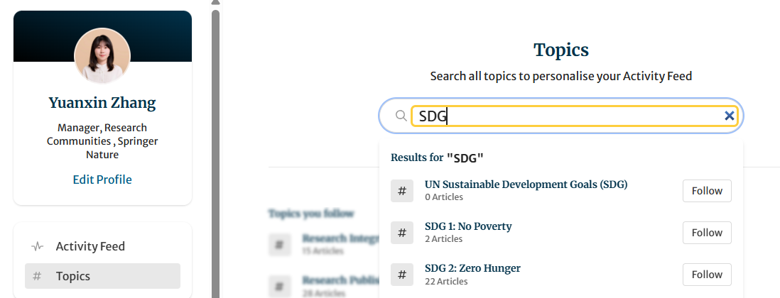 You can also search SDG Topics in your Activity Feed by clicking ‘Topics’ on the left-hand side of the Activity Feed to browse and discover related content.