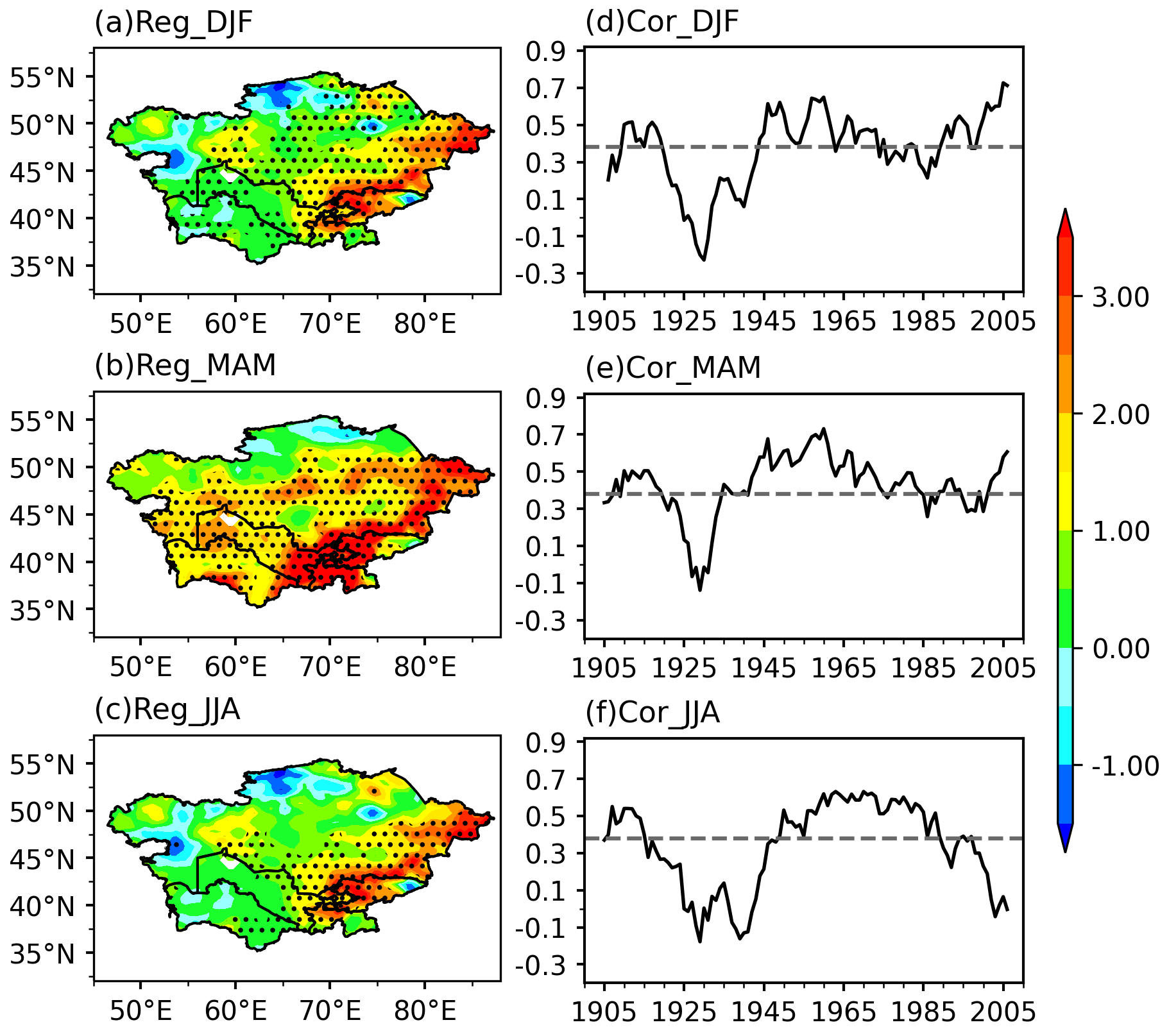- Chen, X., Wang, S., Hu, Z., Zhou, Q. & Hu, Q. Spatiotemporal characteristics of seasonal precipitation and their relationships with ENSO in Central Asia during 1901–2013. J Geogr Sci. 28, 1341-1368 (2018).