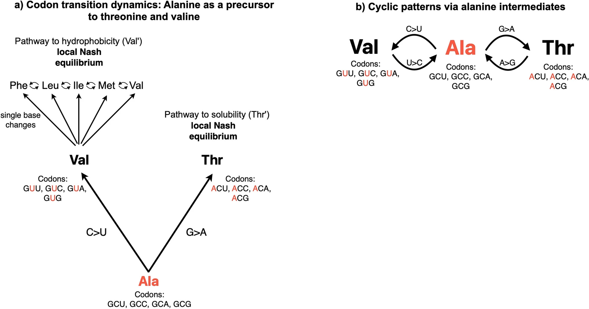Alanine-centric model for the evolution of T-V relationship: This panel shows two evolutionary pathways centered around alanine (Ala). The "Pathway to hydrophobicity" (A > V) represents the evolution from alanine to valine and other nonpolar amino acids (F, L, I, M, V) through single base changes. The "Pathway to Solubility" shows the evolution from alanine to threonine (Thr). Both pathways are described as reaching a local Nash equilibrium. (DOI: 10.1007/s00239-025-10262-8)