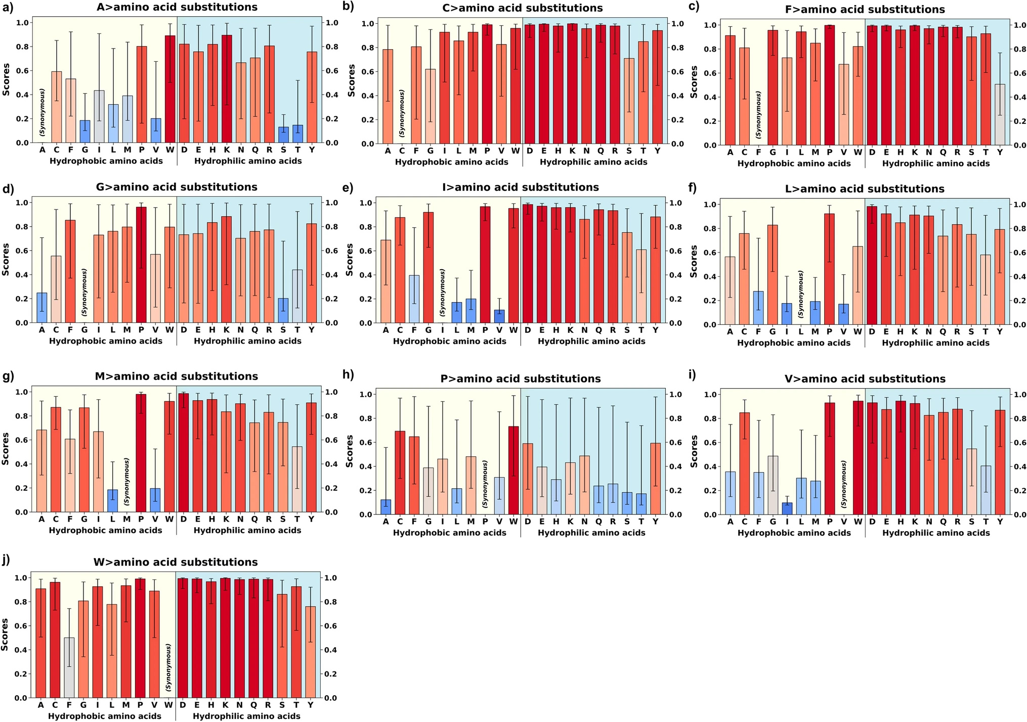 AlphaMissense pathogenicity scores of the variants from hydrophobic amino acids of structurally known alpha-helical transmembrane proteins. AlphaMissense scores, derived from machine learning algorithms trained on genomic and structural protein data, estimate the likelihood of amino acid substitutions being pathogenic to protein function. (DOI: 10.1007/s00239-025-10262-8)