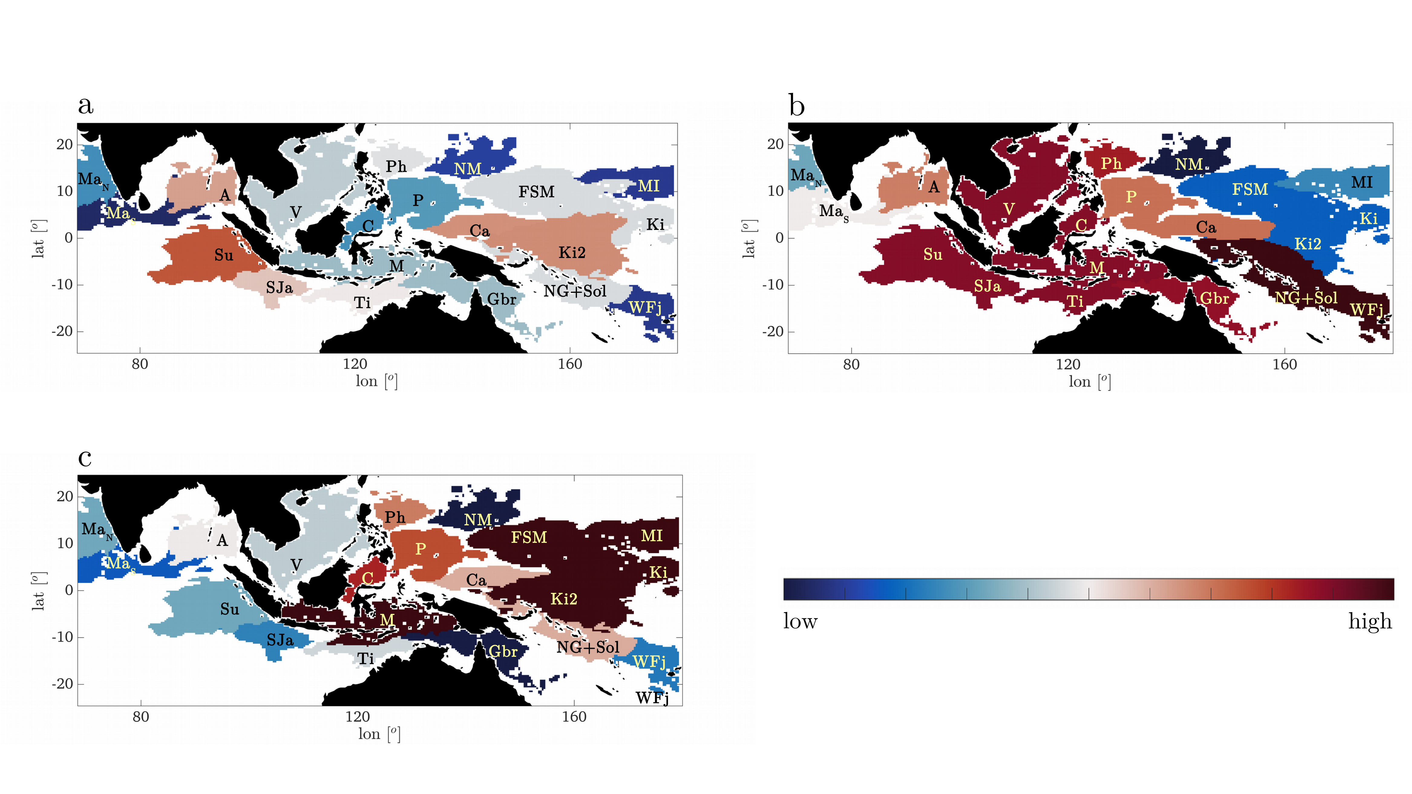 Fig. 2. Biodiversity Score over the period 1993-2017 for the domains found during (a) El Niño years, (b) La Niña years, (c) Neutral years. The color scale is linear (low = 0.03, high = 0.08).