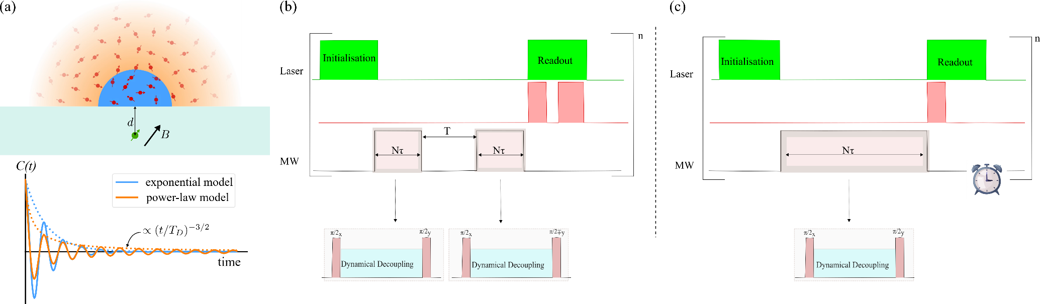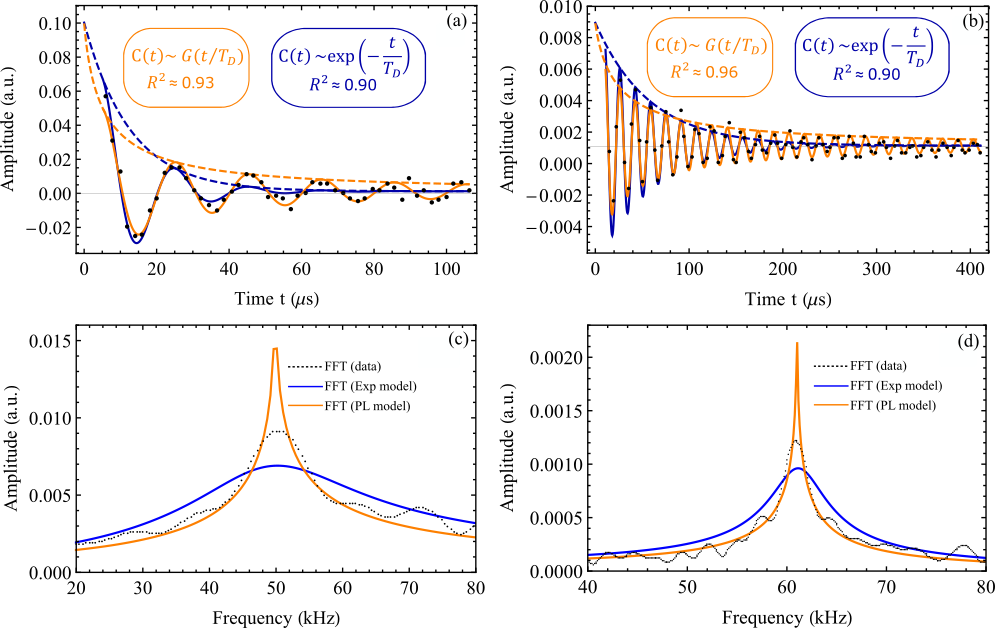 We used correlation spectroscopy [2] on two of these experiments, as it directly measures the correlated quantum phases at two interrogation times, separated by a time T + Nτ each [see figure 1 (b)]. This allows us to directly characterise the decay of the magnetic field. By extending the measurements much beyond the typical time of exponential decay we were able to demonstrate that correlations indeed survive beyond such time, validating the power law model which better describes the signals that we obtained [figure 2]. The distinction between the two experiments is that while one used a single NV centre and measures protons, the other uses an ensemble of NV centres and measures fluorine nuclei, with which we can rule out the signal from the tiny immobile water layer absorbed on the diamond surface, thereby avoiding surface effects.