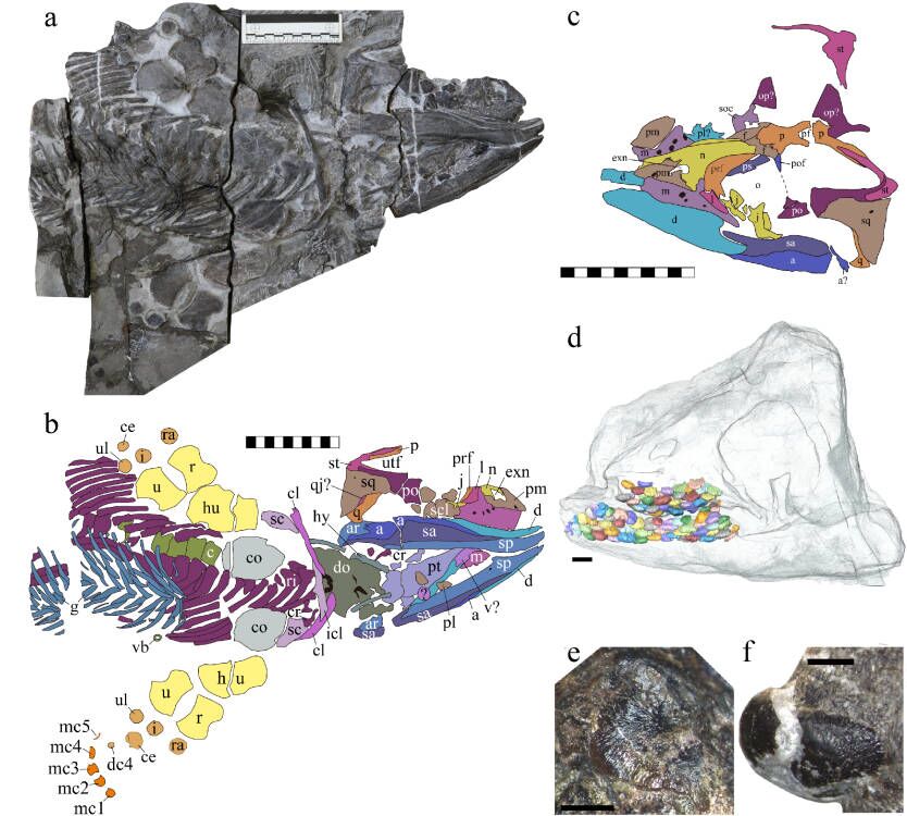 During the preparation of the fossil, a mouth full of rounded teeth with a characteristic ‘orange-peel-like’ enamel surface was revealed. Such teeth were unique among the marine reptiles from the Chaohu fauna and intrigued our team. As preparation work progressed, a nearly perfect three-dimensional skull was uncovered, and CT-scanning revealed numerous replacement teeth hidden in the upper and lower jaws (Fig. 3), very similar to Omphalosaurus, an enigmatic marine reptile from the Early and Middle Triassic of North America and Europe. Omphalosaurus fossils were known since the early 1900s, but they were represented only by fragmentary fossils, most often jaw fragments with teeth. As a consequence, paleontologists have not been able to determine exactly which group of reptiles Omphalosaurus was most closely related to. Several groups, such as rhynchosaurs, placodonts and ichthyosaurs were proposed as the closest relatives of Omphalosaurus, but its exact position within the reptile evolutionary tree remained unresolved.