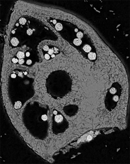 SEM image and backscatter electron (BSE) images from cross-sections of the benthic foraminifera Cassidulina teretis show the presence of rounded clots formed by micrometric pyrite crystals precipitated inside the test. The specimen in this image is ca 150 microns in diameter.