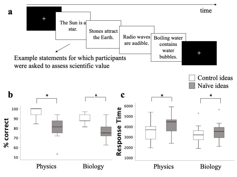 In our study, we looked at the brain activity of 25 scientists with a PhD in physics assessing the scientific value of statements regarding naive ideas about various concepts in physics and biology: gravity, evolution, matter, heat, etc (Fig.1). We found that scientists are slower and have lower accuracy when confronted with naive ideas compared to matched control ideas, despite their advanced scientific training.