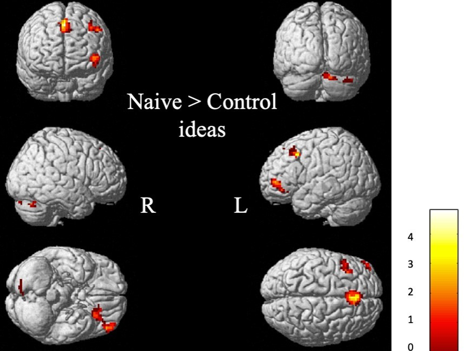 Figure 2 Brain activity – Brain areas more active when processing naïve vs. matched control ideas in science.