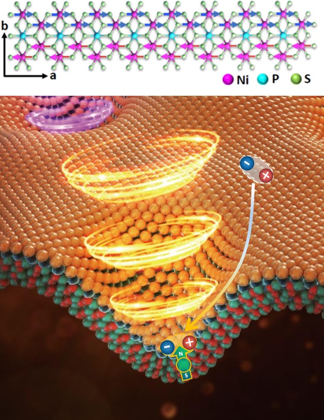 Figure. Top: Atomic structure of NiPS3 crystal. The electronic spins of Ni atoms are aligned parallel (blue arrows) and antiparallel (red arrows) to the crystallographic a-axis, forming a zig-zag antiferromagnetic order. Bottom: Schematic illustration of a nano-indent in a monolayer of WSe2(orange balls) stacked on top of a thin NiPS3 crystal (green and red balls). The strain from the nano-indent causes the formation of potential well, trapping the electron-hole pairs (excitons) in WSe2, along with a defect possessing an out-of-plane magnetic moment in the antiferromagnetic NiPS3 crystal at the same location. The proximity interaction between the localized electron-hole pair and the magnetic moment gives rise to the emission of chiral quantum light.