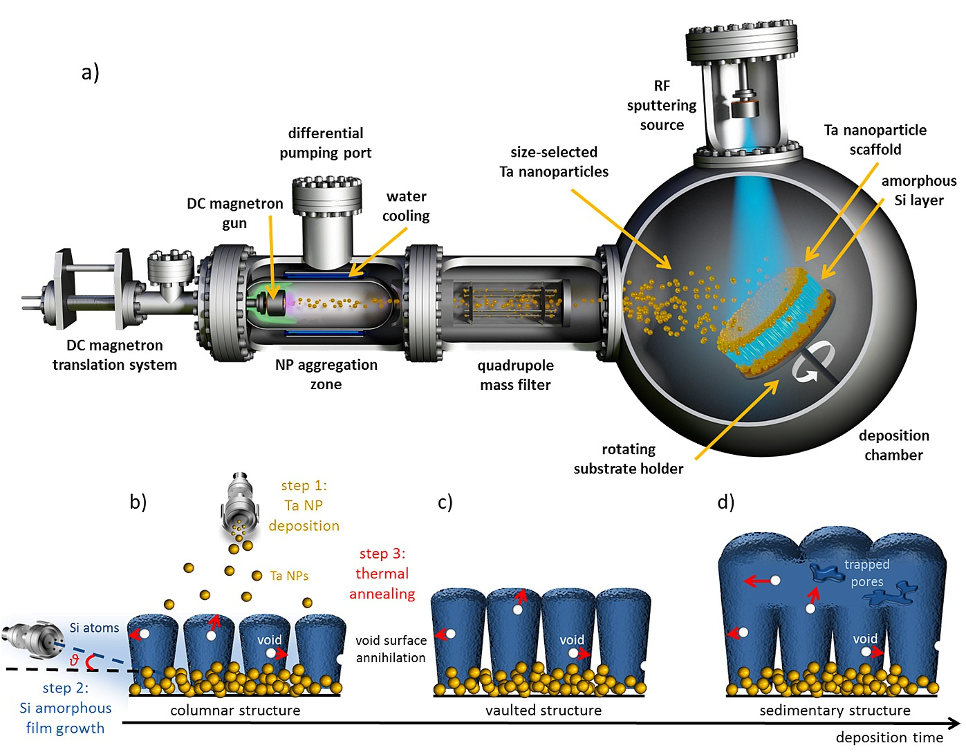 An answer to a fundamental question as old as nanoscience itself [1]: can macroscopic concepts and properties be transferred to the nano-regime? A real-world application in lithium-ion batteries, which have “revolutionised our lives… laid the foundation of a wireless, fossil fuel-free society, and are of the greatest benefit to humankind” [2]; A multi-disciplinary approach consisting of physical vapour deposition, PF-QNM, TEM and SEM characterisation, electrochemistry, and large-scale atomistic computer simulations. These are all ingredients of our recent study just published in Communications Materials, where we (i) identified an optimised building block for silicon anodes for lithium-ion batteries, (ii) built it with a cheap, single-step, green, and scalable cluster beam deposition method, and (iii) elucidated the underlying physical mechanism behind its growth and elastic properties with molecular dynamics computer simulations.