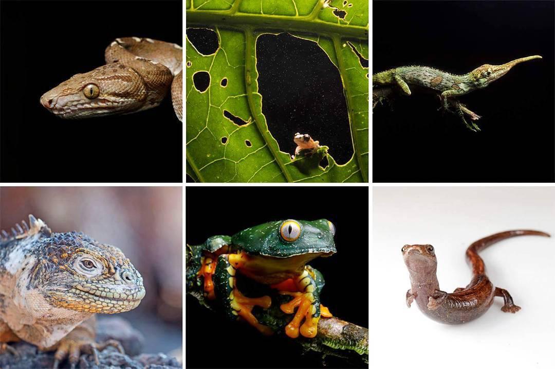 Examples of reptile and amphibian diversity in Ecuador. From top left to bottom right: Amazon tree boa, rain frog, Pinocchio lizard, Galapagos land iguana, fringed leaf tree frog, tropical salamander (Photos by Aaron Pomerantz).