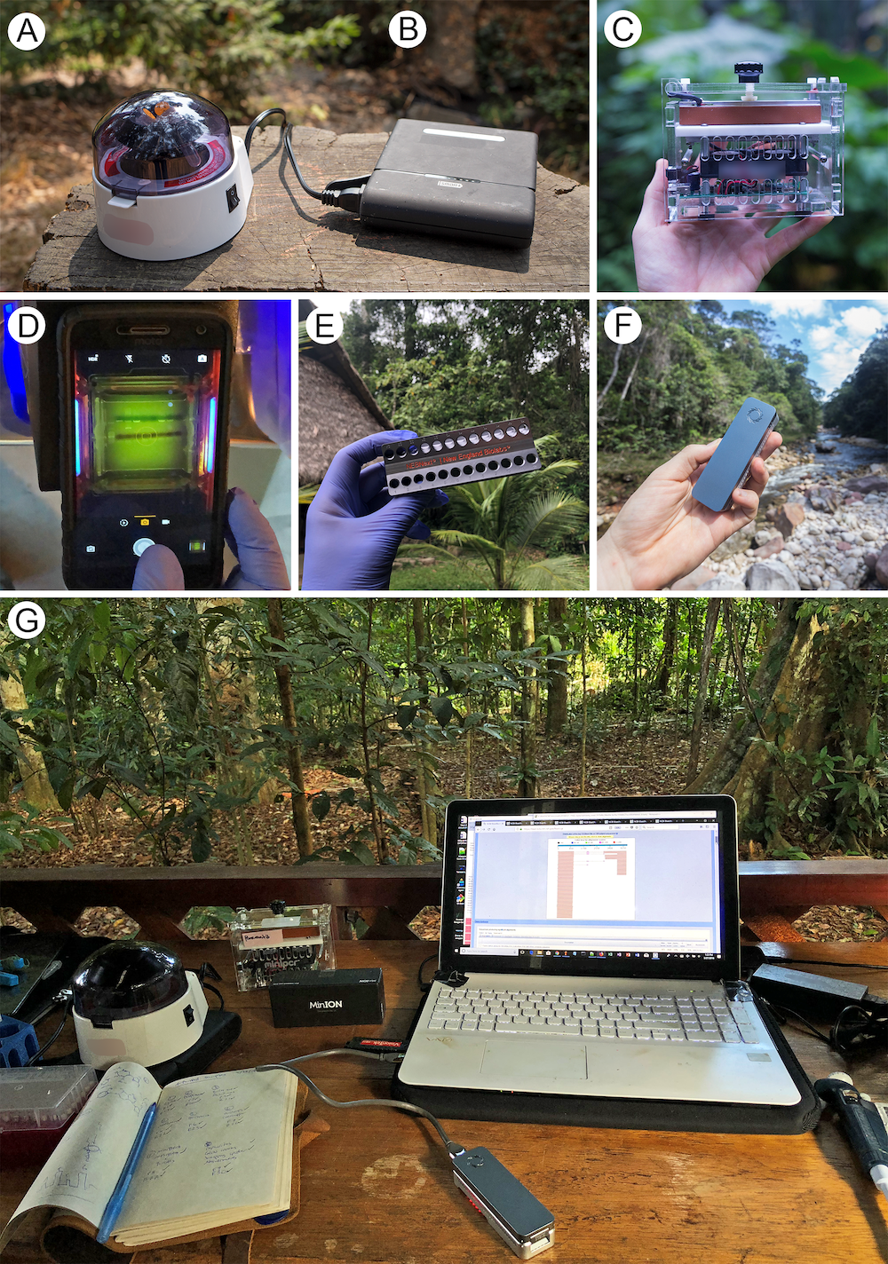 Over the past few years, portable genomics laboratories have been deployed around the world in a diverse set of ecosystems and settings, including the rainforests of the Congo, Ecuador and Madagascar, out at sea and on ice caps, as well as being used to monitor disease outbreaks such as Ebola in West Africa or Zika in Brazil, and for educational programs at universities or in the field. Following several years of experimentation and refinement of MinION-based methods by the scientific community, combined with the optimization of other commercially available field-deployable laboratory equipment, we felt that there was now an opportunity to put together a step-by-step protocol for DNA amplicon sequencing (a technique that amplifies a short piece of DNA which can subsequently be used for species identification purposes) using miniaturized laboratory equipment, as a resource for the community and new users interested in getting started.