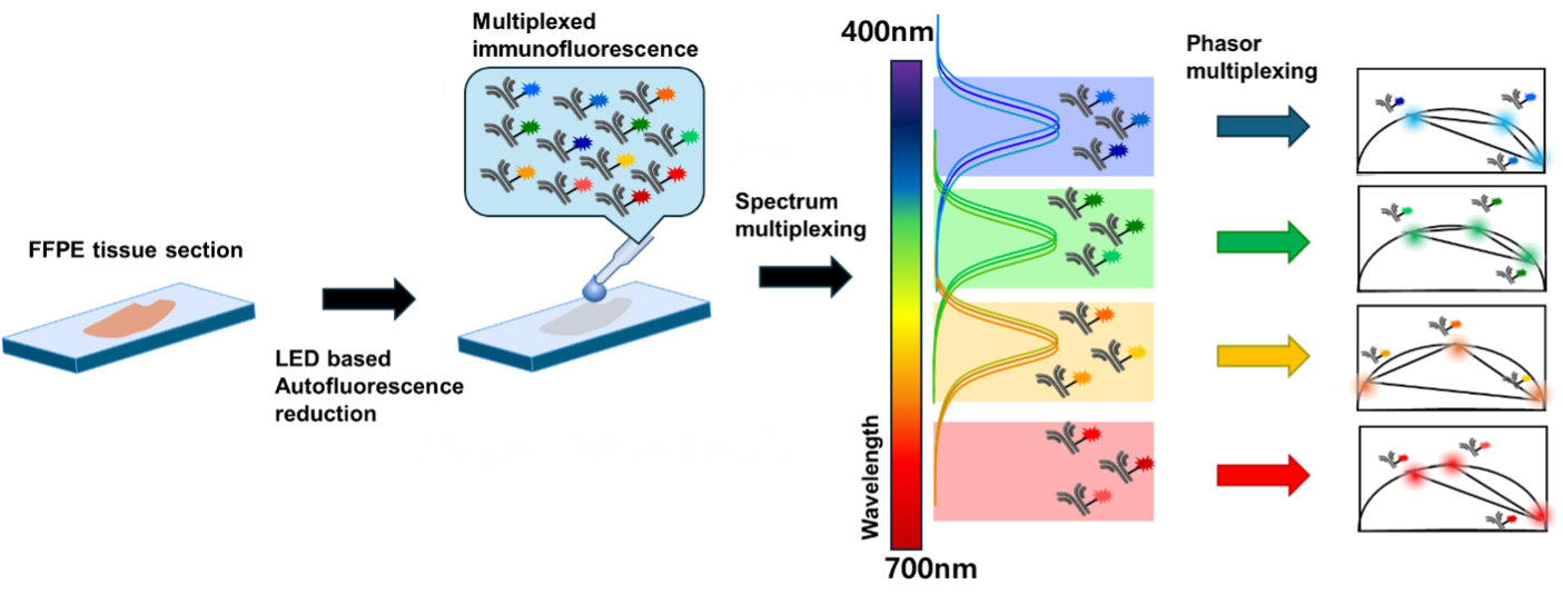 To address this challenge, we have developed an innovative solution called Fluorescence Lifetime multiplEXing (FLEX). FLEX is a highly multiplexed imaging approach allowing up to 11-plexed biomarker imaging within a single tissue sample in 3D. Unlike conventional immunofluorescence, FLEX leverages not only the fluorescence spectrum of fluorophores but also their unique fluorescence lifetimes, which are determined by their chemical structures.