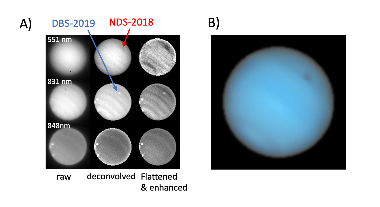 A wholly unexpected discovery from this analysis was the presence of a bright cloud just to the southwest of NDS-2018. Bright 'companion' clouds are often seen with dark spots, but these are usually upper troposphere methane ice clouds at pressures of 200 - 600 mb. The new spot we discovered, however, was based much deeper, again down in the Aerosol-1 cloud/haze layer at ~5 bar, which we call DBS-2019 (Deep Bright Spot 2019). The spectral signature of DBS-2019 is consistent with a spectrally-dependant brightening the particles in this layer at wavelengths longer than ~650 nm. Again, what causes this is a mystery, but it is intriguing that both the NDS-2018 and DBS-2019 features are caused by a spectrally-dependent darkening or brightening of the same layer, which suggests some connection. What we do know, however, is that DBS-2019 was short-lived. Only the spectral resolution of instruments such as MUSE is able to distinguish such deep clouds from upper tropospheric methane ice clouds, but imaging observations would have detected the spot had they been viewing Neptune at the same time. However, imaging observations taken just a couple of weeks before and after our observations on 18th October revealed no trace of DBS-2019.