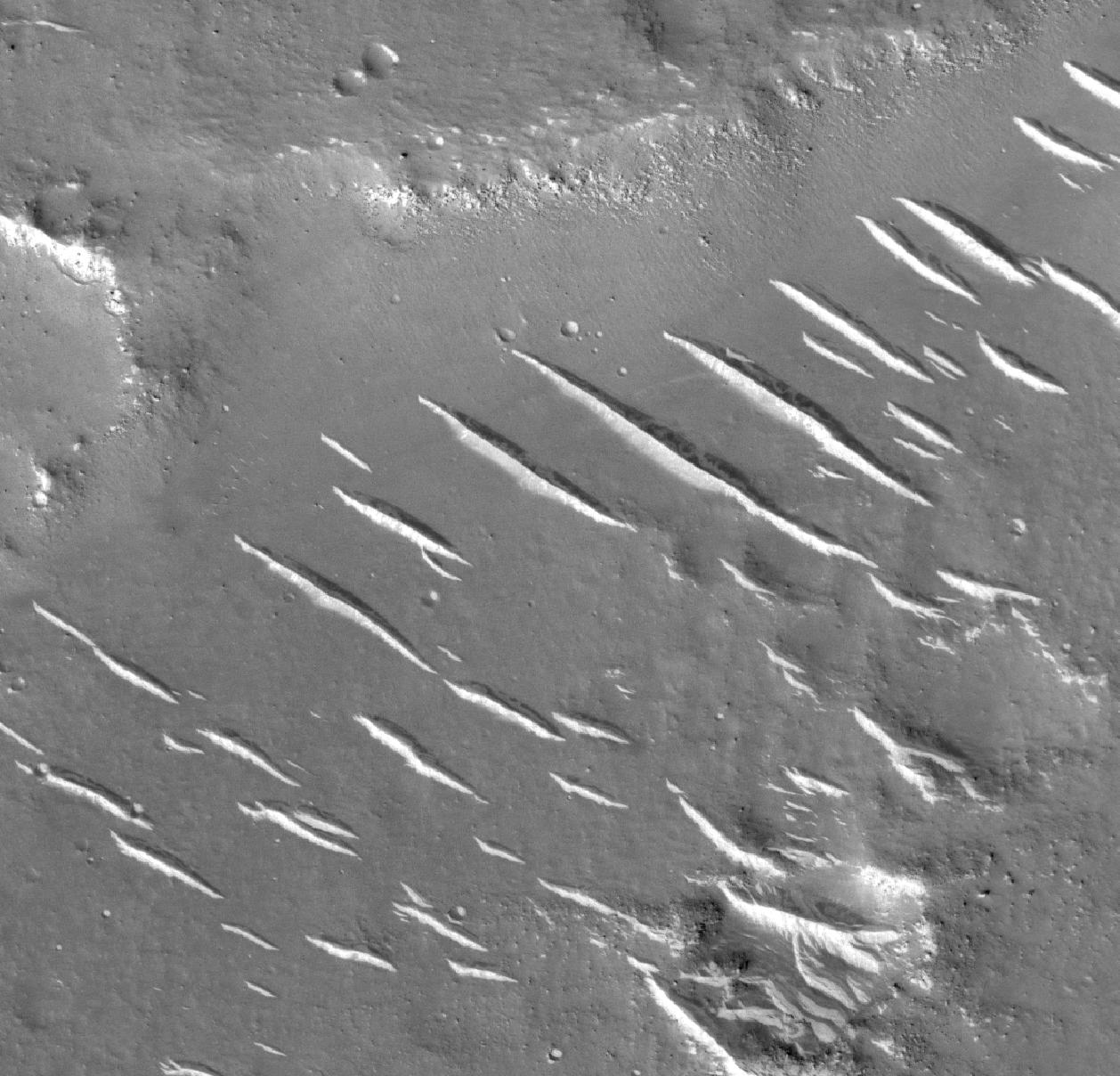 Figure 2 shows a relatively smooth surface composed of granular materials and dust, with some prominent ridges - either linear dunes or yardangs, which are linear ridges of poorly consolidated wind-blown material. Such landforms are found in windswept deserts on Earth. The image also shows bedrock exposed in gentle, eroded and topographically muted cliffs that make up boundaries of what is called polygonal terrain characteristic of the Utopia region. The eolian landforms, shallow cliffs and smooth surfaces with occasional blocks of rock seen in this image are likely representative of the landscape the rover will encounter.