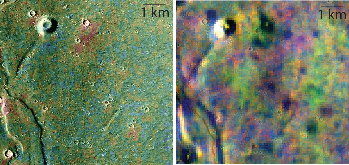The image on the right in Figure 3 is also from THEMIS, but this is a multispectral daytime infrared image showing compositional differences as color variation. In this spectral combination, basaltic volcanic materials are generally blue-purple and alteration minerals formed by water appear yellow. It is not possible from these data to determine the exact minerals present, but it is encouraging to see that there are probably multiple compositional units in the landing region.