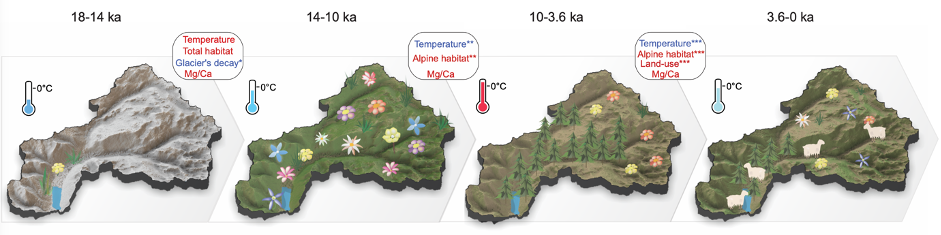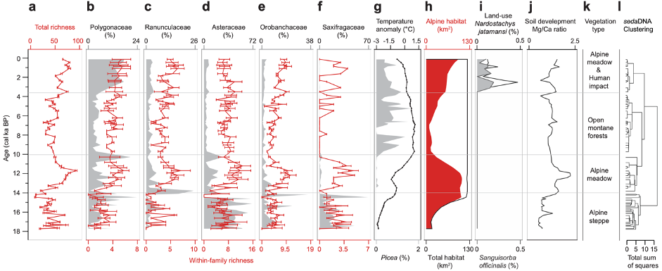 SedaDNA records four vegetation stages: alpine steppe dominated 18–14 ka, alpine meadow 14–10 ka, open forest 10–3.6 ka, and alpine meadow after 3.6 ka with the presence of typical land-use indicators. Within these time intervals, total plant taxa richness was relatively low before 14 ka, higher during 14-10 ka, low again until 3.6 ka and high after 3.6 ka. We observed a similar pattern in within-family richness.