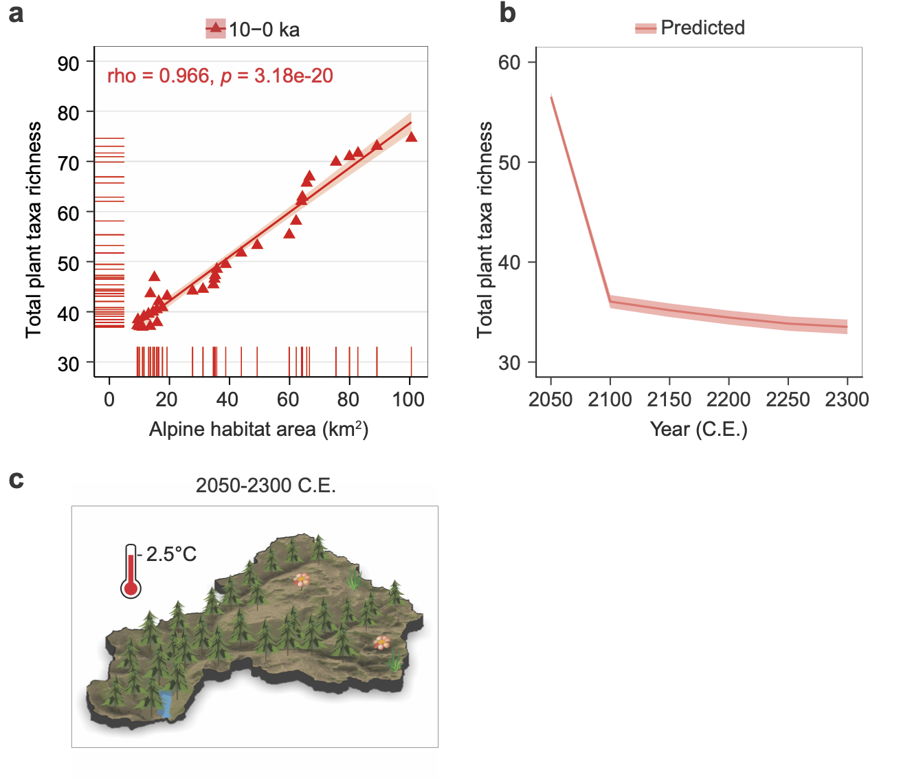 We found a strong positive relationship between total plant taxa richness and forest-related alpine habitat after 14 ka. Although human impact promoted total plant taxa richness since 3.6 ka, its effect was smaller than that of alpine habitat. Consequently, a noticeable loss of alpine habitat with upslope advance of forest leads to a pronounced decrease in total plant taxa richness, especially for endemic-rich alpine plant families during 2050-2300 CE. With respect to conservation, alpine habitats should take priority.