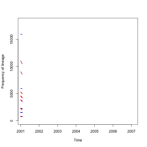 Simulations of the S. pneumoniae population: each line shows the frequencies of a strain in the post-vaccine population. The more red the line, the higher the proportion of the strain targeted by the vaccine; the more blue the line, the higher the proportion of the strain unaffected by the vaccine.
