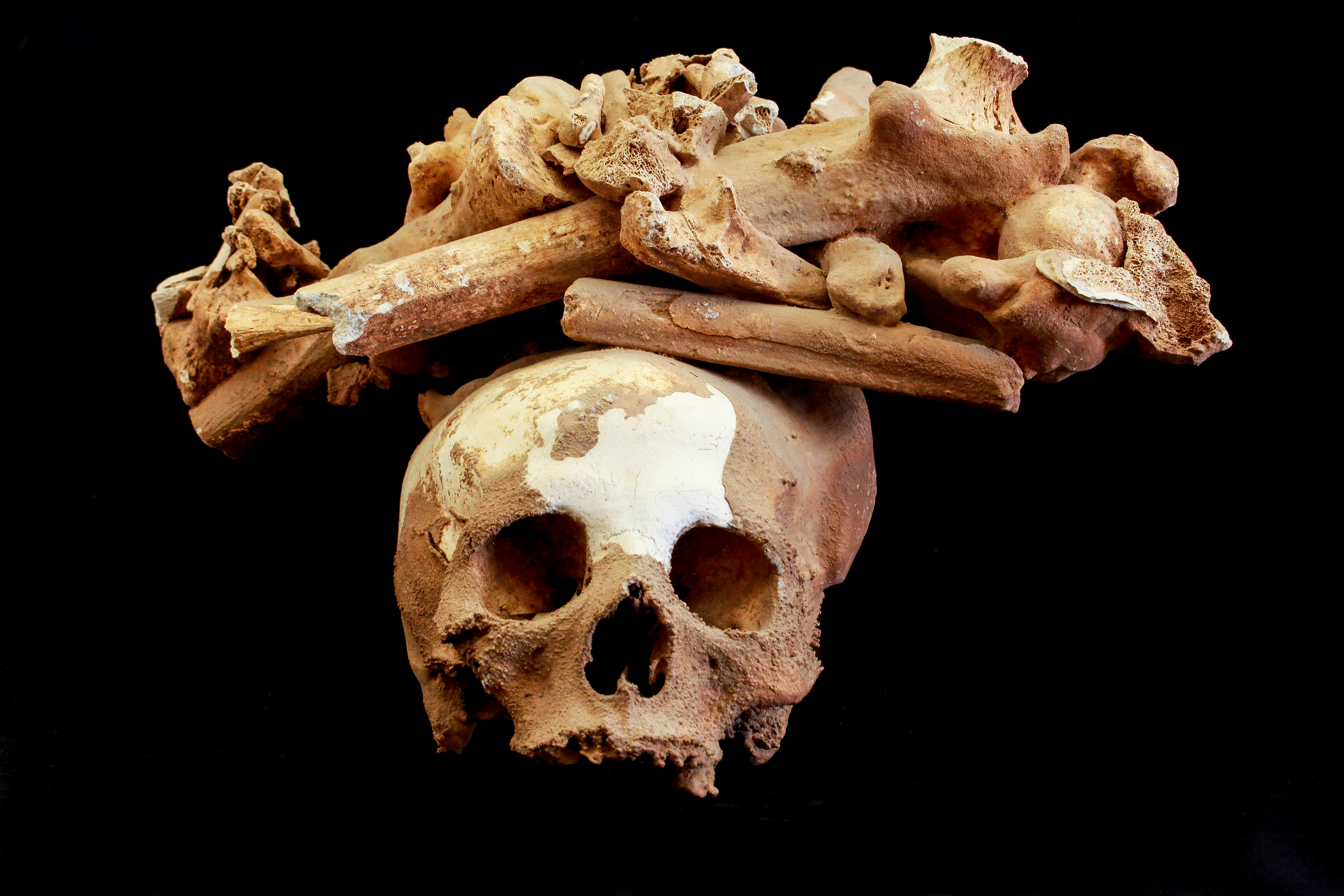 Figure 3: A skull and long bones partially covered by lime stone, excavated at Peki'in cave (Photo Ariel David)