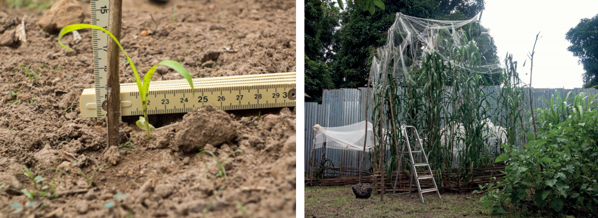 Pearl millet growing experiments: Day 14 (left) and Day 94 (right). Experimental work was carried out by Hans-Peter Wotzka, Judith Amba Bongongo, Roger Kidebua, Ferdinand Bokomba Bwamangele and Joël Bosongo Andiswa in Iyonda, Democratic Republic of the Congo. Photo credit: Wotzka (2016).