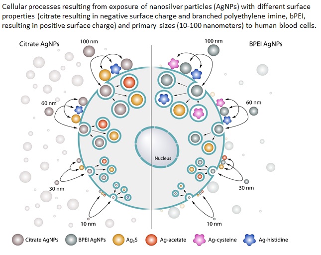 In summary, based on our single cell level studies of nanoparticle-cell interactions we have been able to elucidate three basic processes that take place when human cells “meet” nanosilver particles. First, the extent of cellular binding and uptake is mainly driven by the surface properties of the nanoparticles: there can be 10-20-times difference in the cellular binding and uptake of nanoparticles depending on the surface properties of the nanoparticles. Second, it is only the intracellularized fraction of nanosilver that exhibits cellular toxicity. And, third, a significant fraction of nanosilver particles are transformed upon their cellular binding and uptake. The preferred transformation pathway is sulfidation which occurs with higher efficacy in the case of smaller nanosilver particles and gets accelerated after cellular uptake. We believe that our findings on nanoparticle-cellular interaction and transformation enhance the ability to accurately predict the biological activity and potential toxicity of nanoformulations.