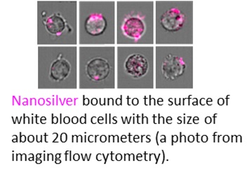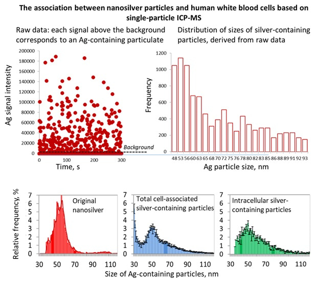 By that we had quantitatively demonstrated the amount of nanosilver that was capable of surface binding and intracellularization when exposed to human white blood cells. However, we had no information whether the cell-associated silver was in it´s original nanoparticulate form or had been transformed during the process. Using single-particle mass spectrometry that enables mass-based size analysis of elemental nanoparticles related with each single cell, we were able to show that silver-containing nanoparticles of similar size to those we used in the original exposures were present in cell surface and in intracellular space. Interestingly, we also detected smaller and larger particles suggesting that nanosilver particles undergo certain changes during or after cellular binding or intracellularization.