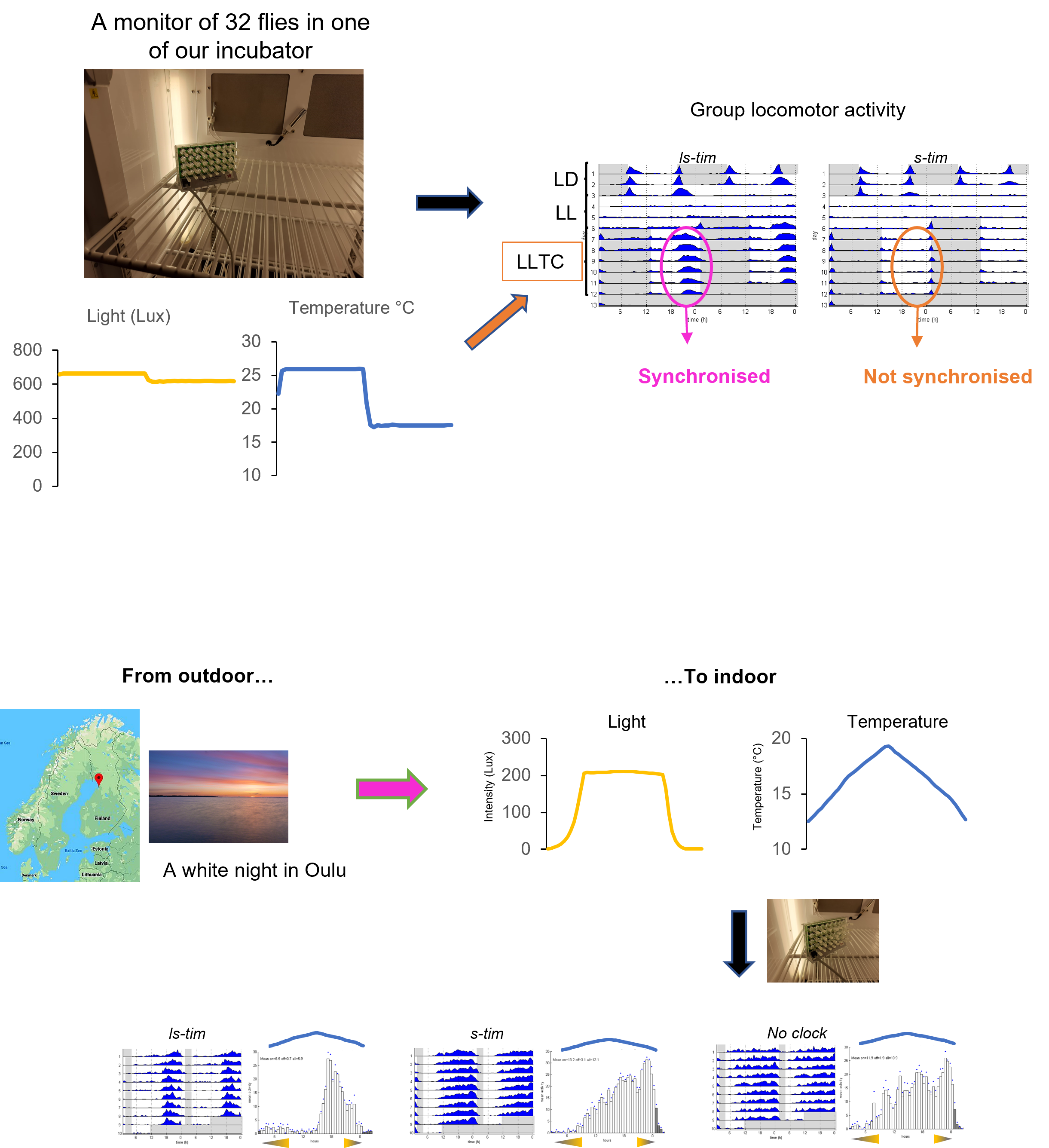 Figure 2: Bearing the ls-tim allele is advantageous in both artificial conditions and Scandinavian summer-like condition. We can record the locomotor activity using monitors (32 flies/monitor). With our incubators, we can control light, temperature and even humidity (not shown here). If a group of flies increase their activity during the same time window then, they are considered to be synchronised.