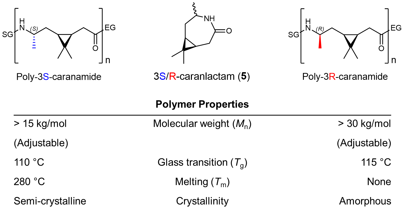 Figure 2. Structures of caranlactam 5 and the stereoisomeric poly-3S- and poly-3R-caranamide and their properties.