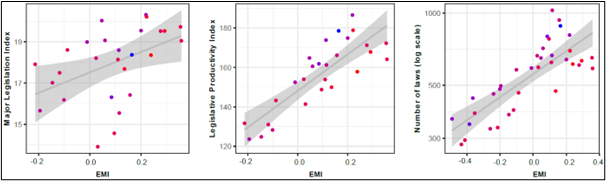 Finally, we considered three different indices of congressional output that political scientists have developed as performance indicators. As shown below, all three are positively associated with the EMI score: the more politicians tacitly or explicitly appeal to evidence in their speeches, the more productive the congressional session. Conversely, the more politicians appeal to intuition, the lesser the productivity of our elected representatives.