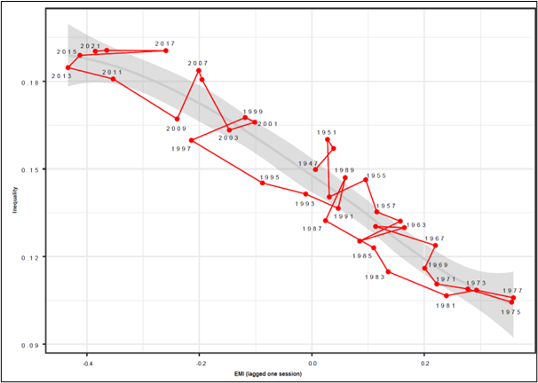 The decline in inequality since World War II until the mid 1970s, and its subsequent dramatic increase that extends to the present, is striking. It is also striking that this association was observed when the EMI was taken from the preceding congressional session (i.e., several years before the observed inequality). One interpretation of this finding is that inequality is at least partly determined by legislation, and that it takes time for that legislation to have an effect.
